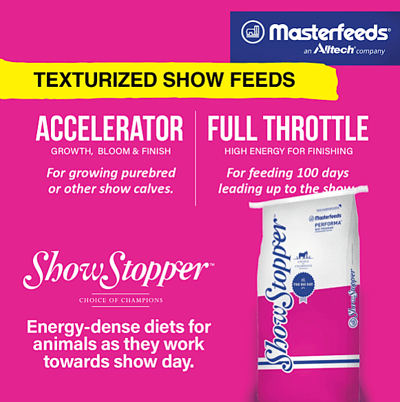 Who Uses: Masterfeeds ShowStopper™ Accelerator is intended for growing purebred or other show calves, and especially 4-H calves prior to their being placed on a final, high energy finishing ration. Ideally, recently weaned calves should be started on a Masterfeeds creep ration. Once the calves have grown to their desired size, they can be converted to ShowStopper™ Full Throttle.