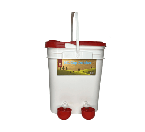 16 L Cup Drinker made of durable and translucent plastic that makes it easy to read water levels while maintaining the cleanliness of the water. The cups attached help prevent waste and spillage, which makes maintaining hygiene withing the coup easy, while ensuring that your poultry stay hydrated.