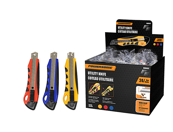 18 MM PUSH LOCK KNIFE RUBBER GRIP - 3 COLORS: yellow, blue, red