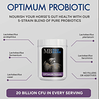 Optimum Probiotic is a pure 5-strain blend of probiotics formulated to balance the horse’s gut microflora, support digestive function and boost the immune system. No fillers, simply a great probiotic supplement at the lowest possible cost. 2 months for $20!!! WOW