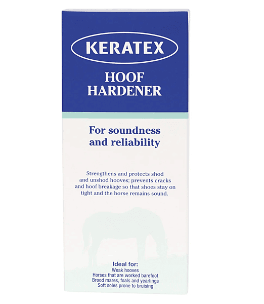 Keratex Hoof Hardener formula is patented and includes a unique flexibility agent as well as a hardening agent, making this the perfect product to help protect your horse from: brittle, cracked, soft or weak hooves; soft, sensitive or thin soles; repeated shoe loss; transition to barefoot; hoof damage. Keratex Hoof Hardener will help strengthen and protect shod and unshod hooves, to restore soundness after sensitive soles and to help prevent existing cracks from laddering up or across the hooves. Because it absorbs into the hooves, it will not ‘come off’ in the field, it will continue to work within the hoof whatever the weather and whatever the field conditions.