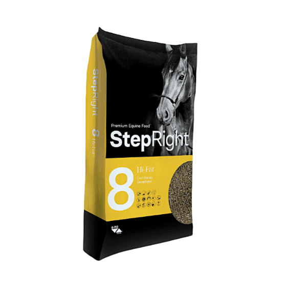 Step 8 - Hi-Fat Cool Energy is a pelleted, vacuum infused feed designed for hard-working performance horses or horses that require fat-sourced energy for better body condition.