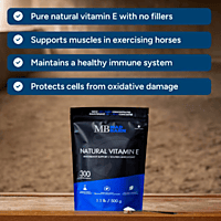 Our Natural Vitamin E supplement provides a highly bioavailable source of pure d-alpha-tocopheryl acetate with no added fillers. Vitamin E is essential for immune function, muscle health, neurological support and antioxidant defenses. Horses on a hay-based diet require supplemental Vitamin E in their diet.