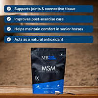 MSM (Methylsulfonylmethane) is a natural supplement commonly used to support joint health, connective tissue strength, and post-exercise care in horses. It supplies key building blocks for collagen and glucosamine production, aiding in the maintenance of healthy cartilage, tendons, and ligaments.