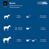 Biotin maintains strong hooves and healthy connective tissues in horses. Essential for keratin production, this B-vitamin also helps maintain a shiny coat and healthy skin. Our concentrated biotin supplement provides a 20 mg serving per day to support hoof growth and improve overall hoof quality.